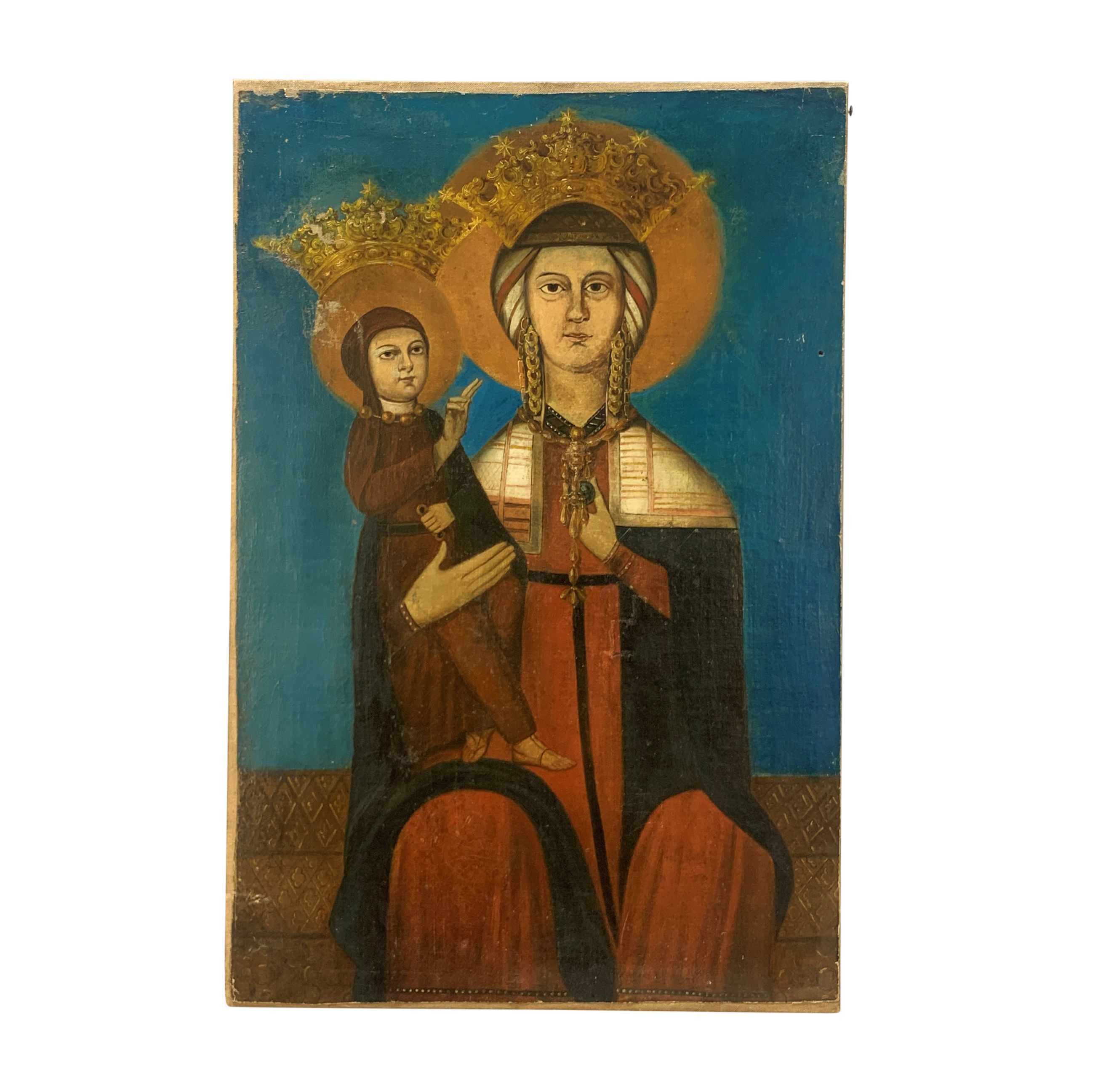 A XVII CENTURY WALLACHIAN OIL ON CANVAS OF THE VIRGIN & CHILD