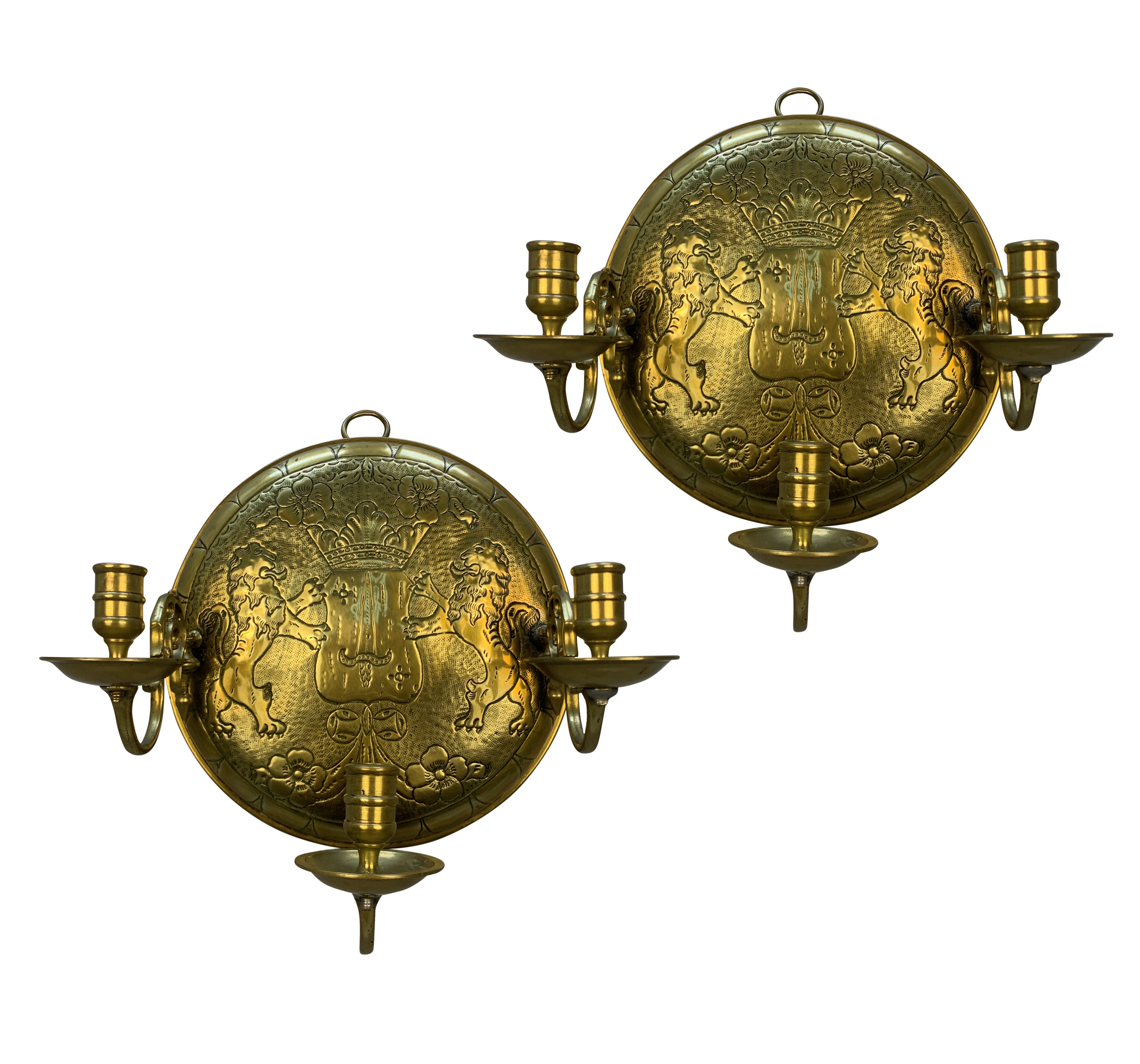 A PAIR OF EARLY DUTCH REFLECTOR WALL SCONCES IN BRASS
