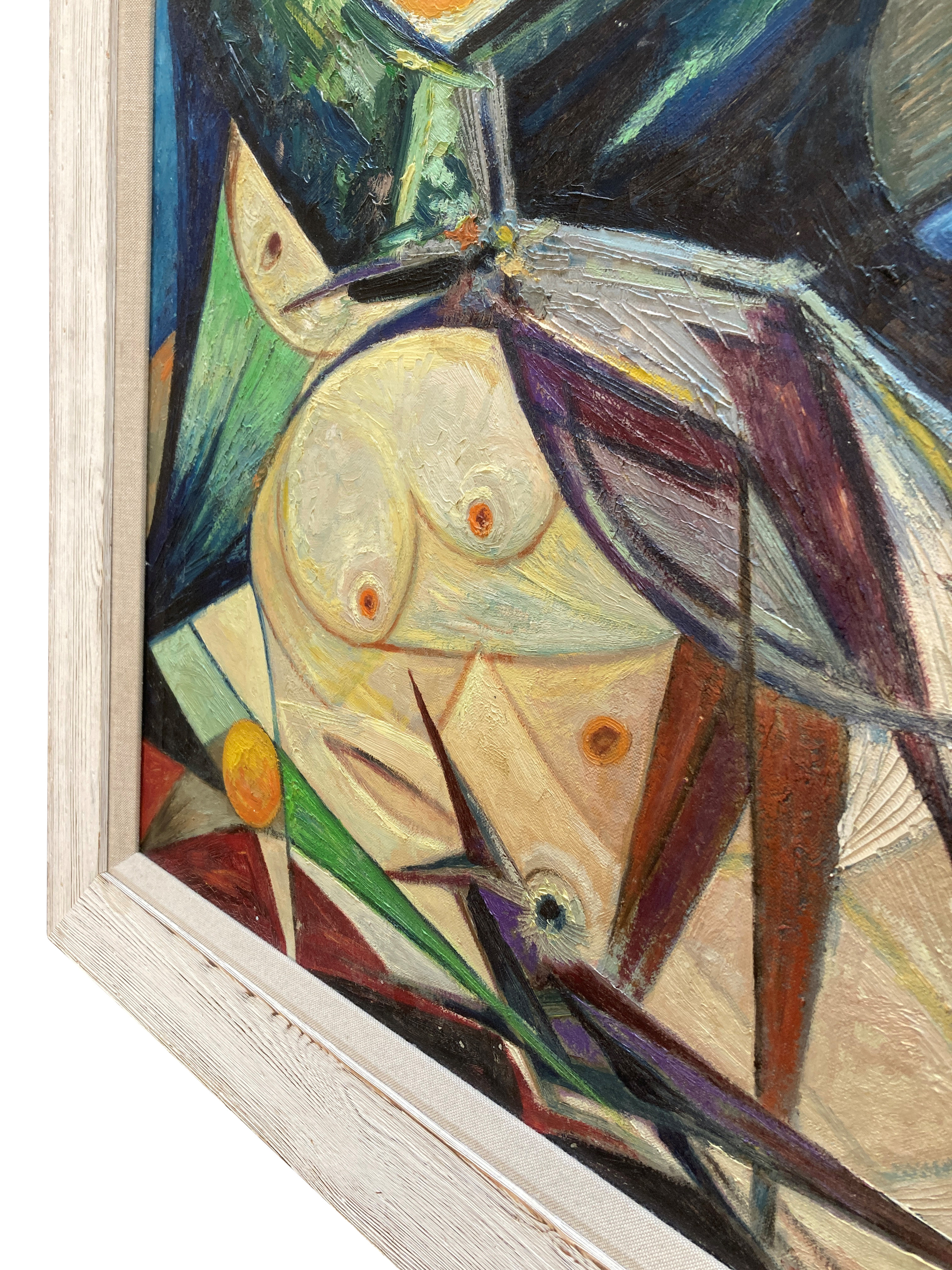 A Dutch framed Mid-Century colourful and textured oil on canvas, depicting a reclining female nude with birds in the sun. By Joseph Hubertus Poels (1903-1977)