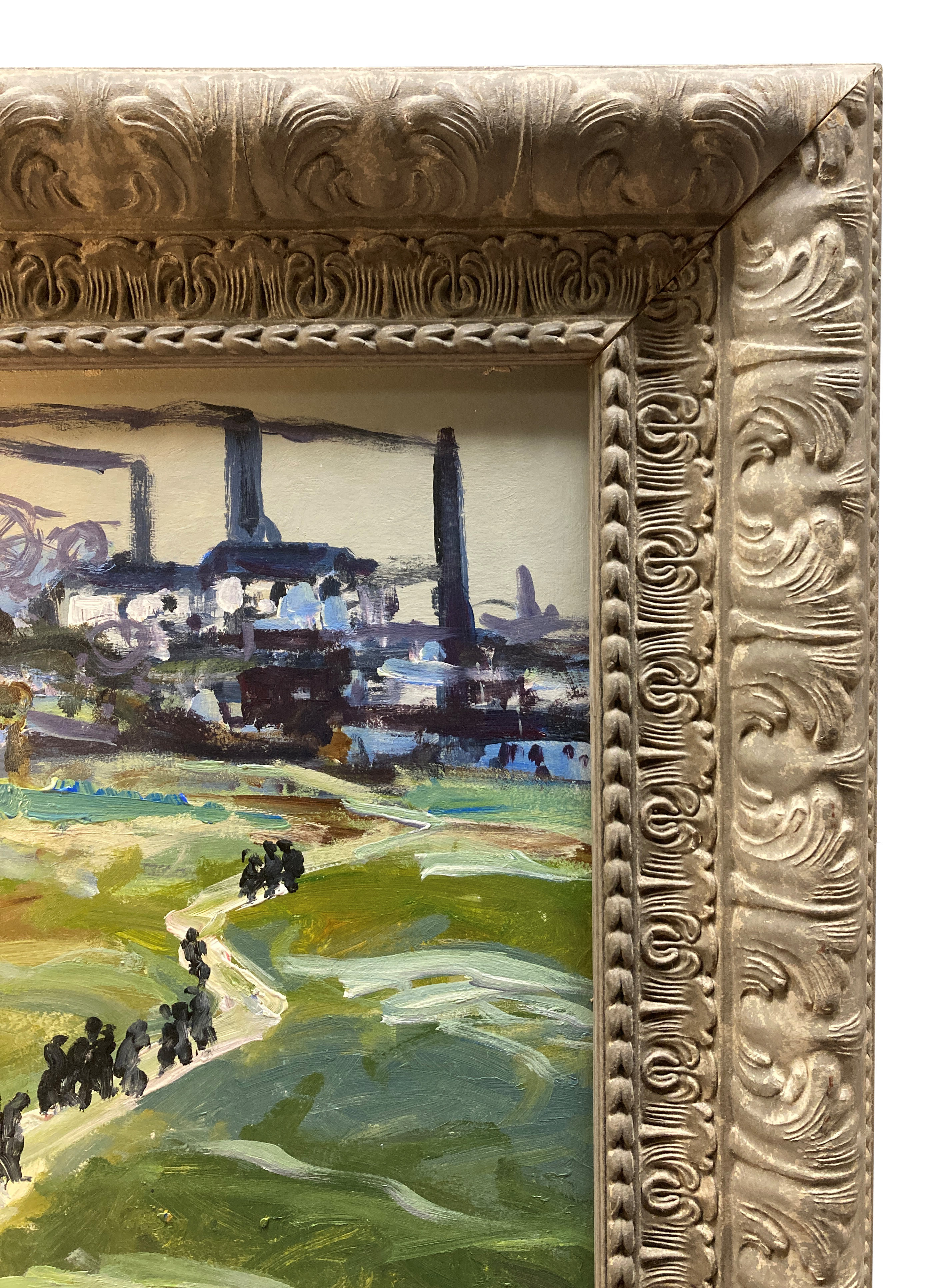 An English oil on panel depicting a colliery scene in an elaborate carved and painted frame.