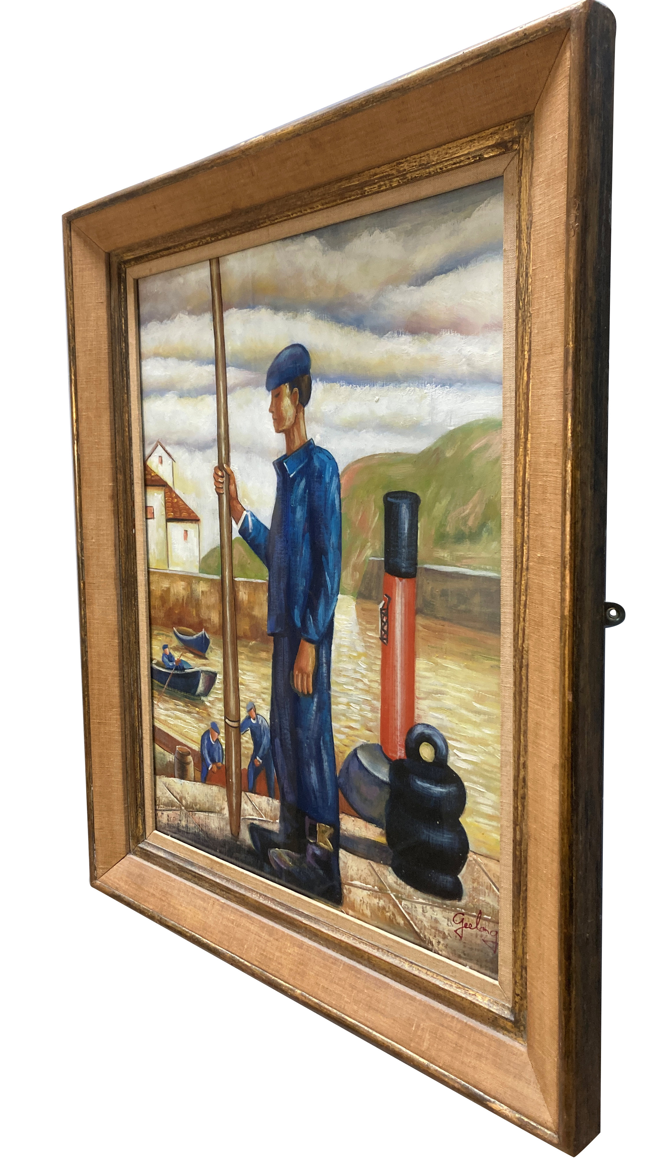 A French framed and glazed oil on panel of a young Breton fisherman.