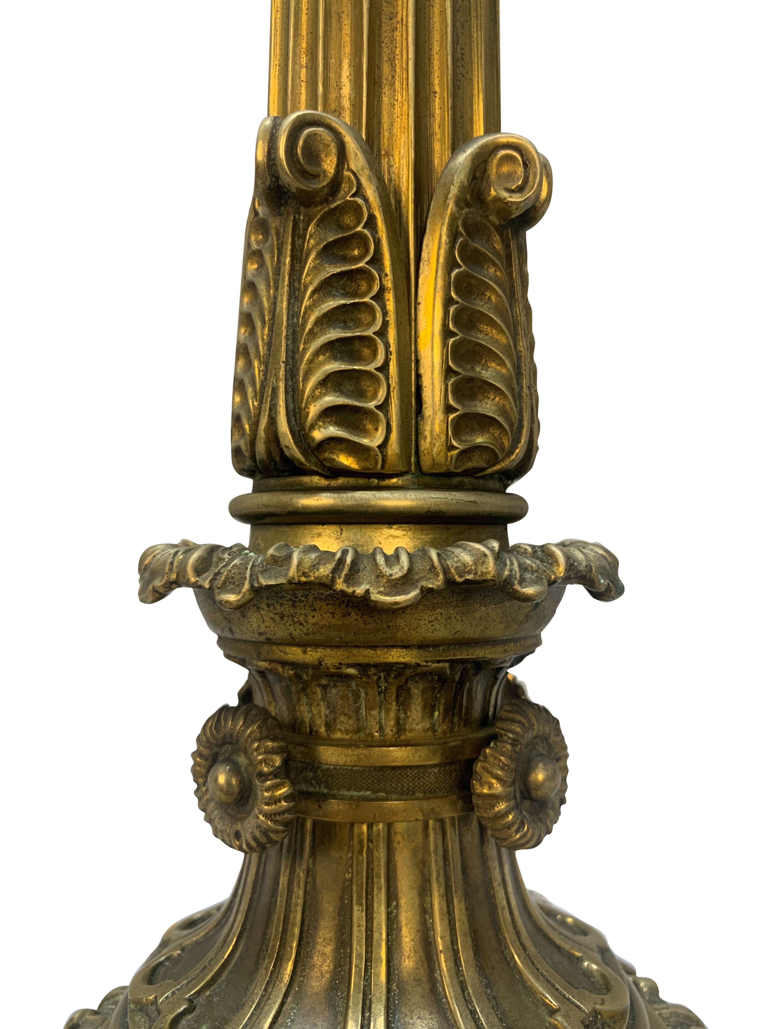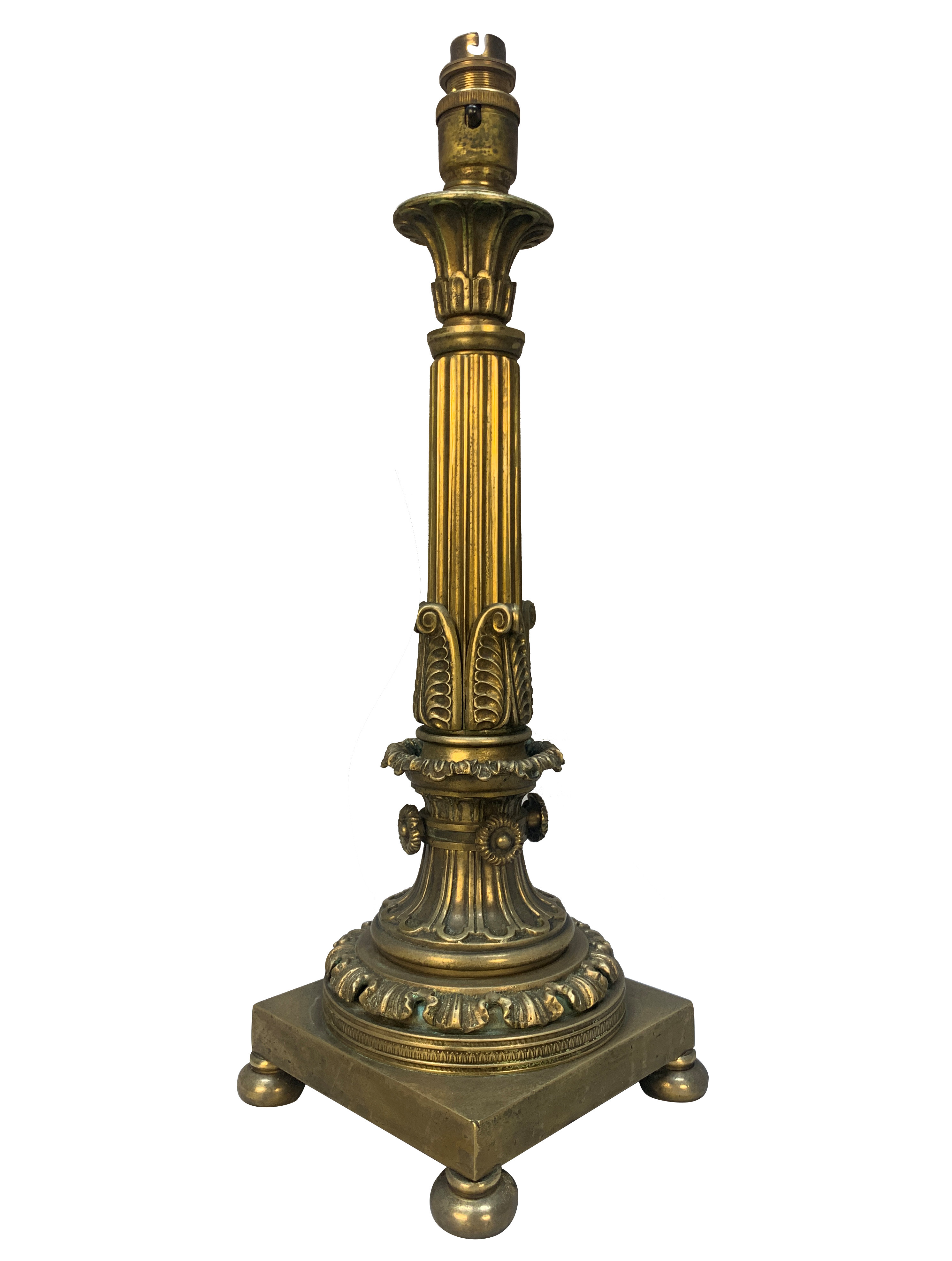 An English George IV gilt-bronze Neo-Classical lamp, with acanthus decoration, reeded column and bun feet.