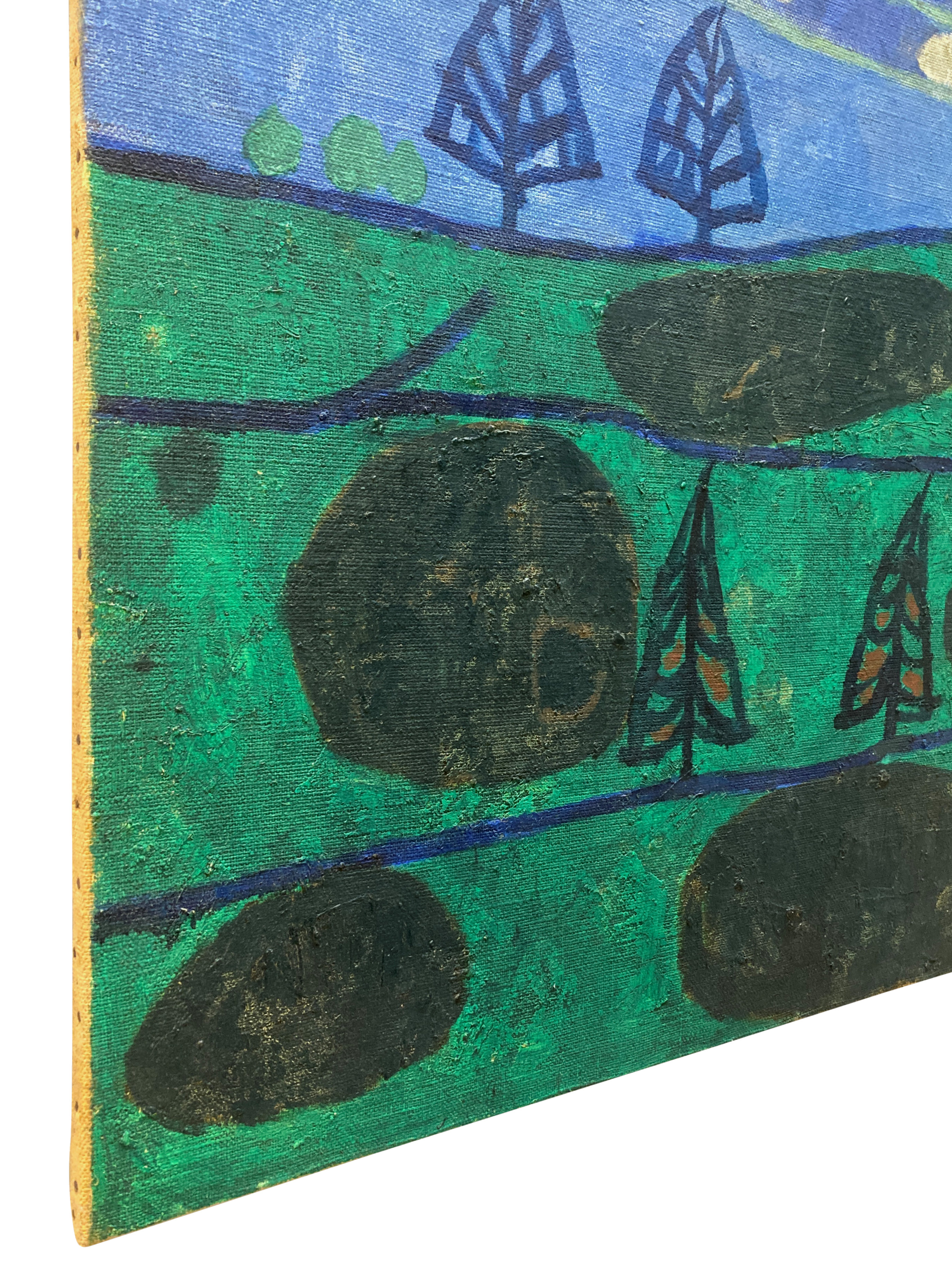 A large American abstract oil on canvas depicting nature in blues and greens, by American artist Donald Tait (1923-2018), who later lived and painted in Paris.