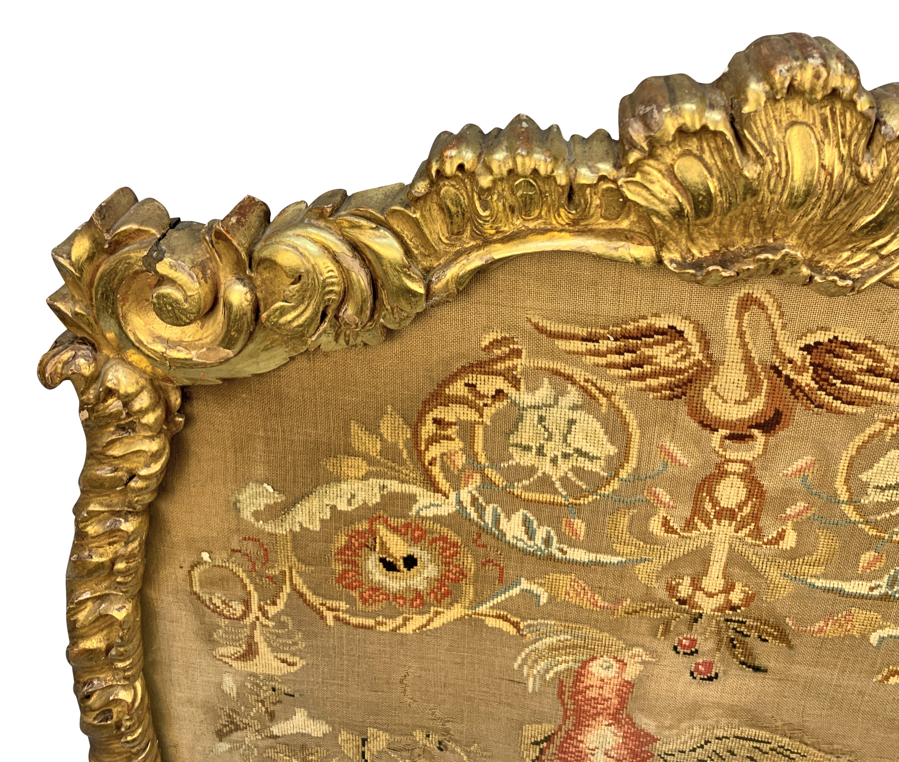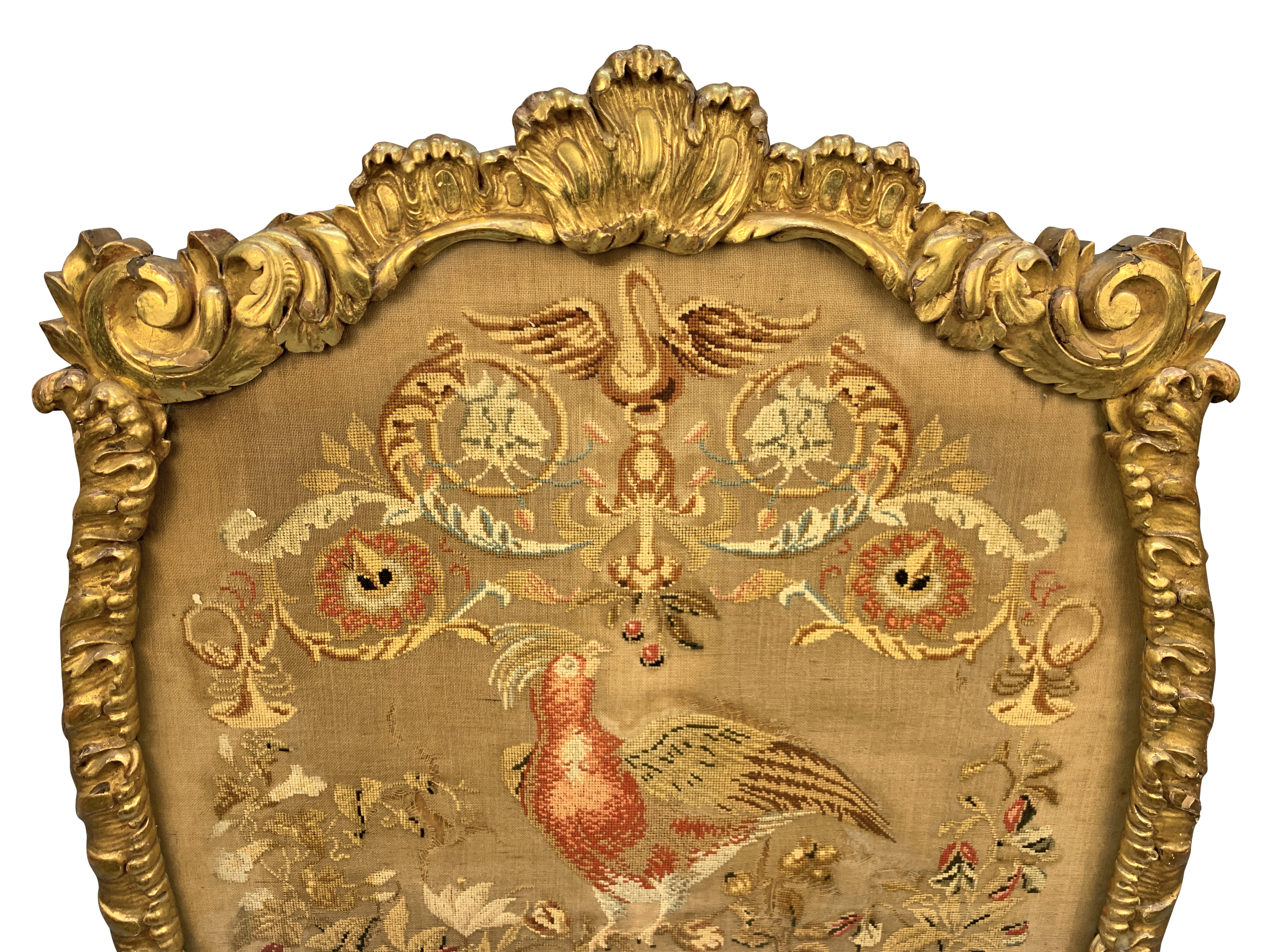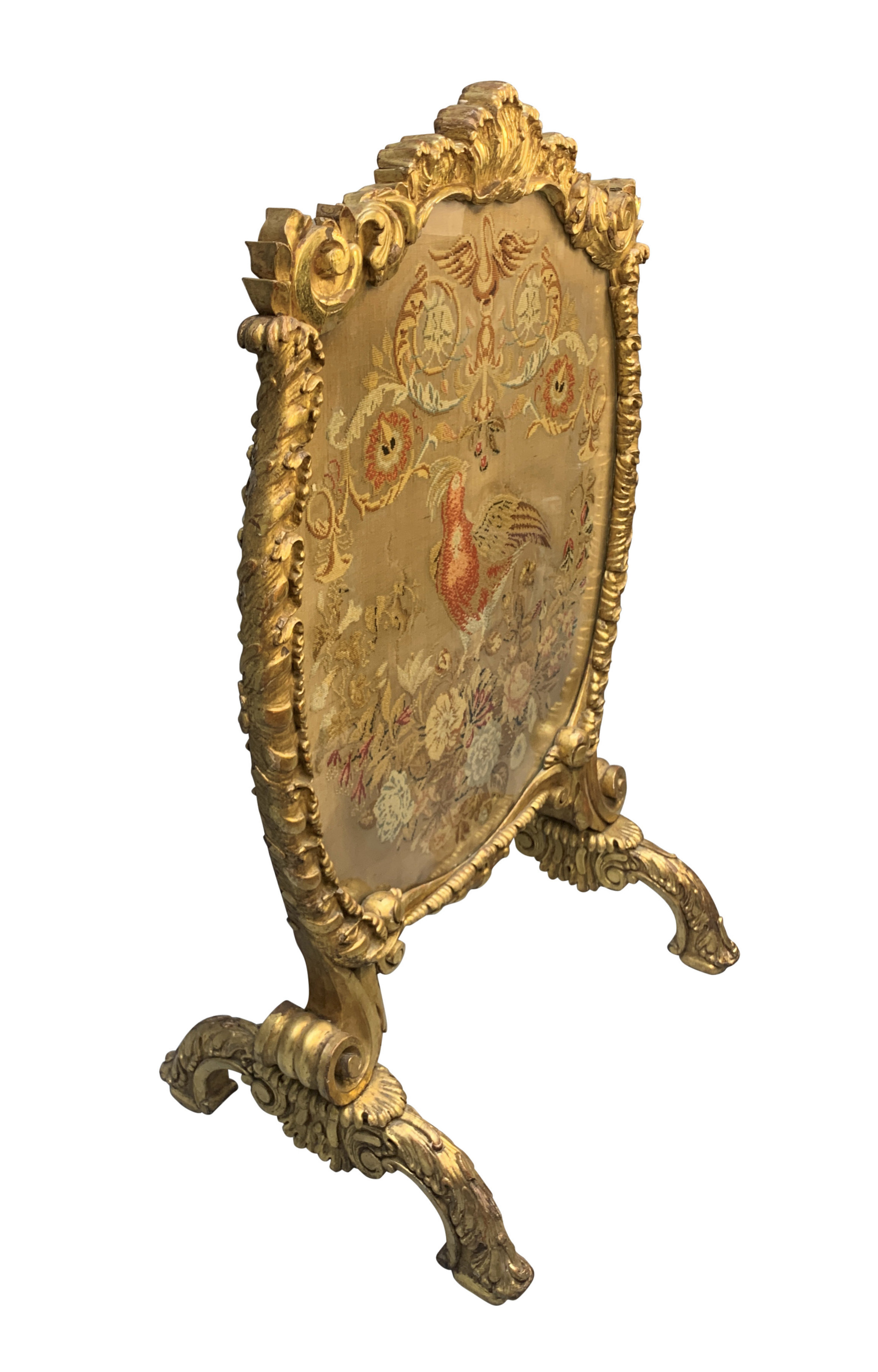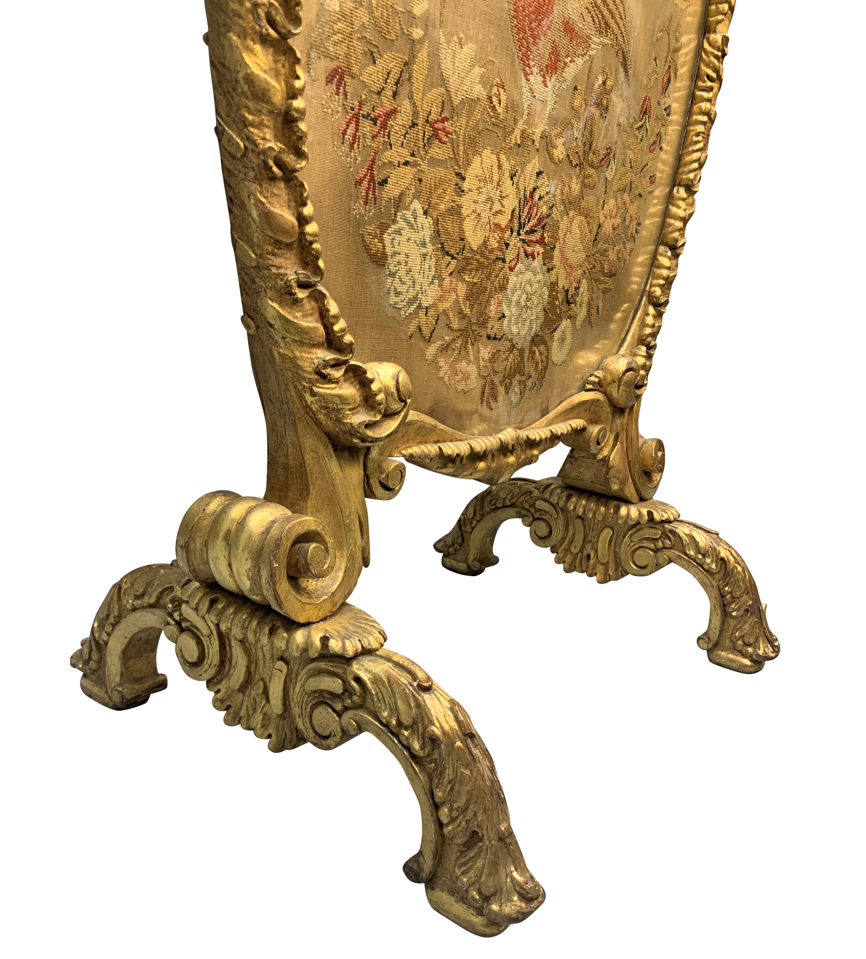 A large and finely carved George III gil-wood fire screen. Containing a beautiful needlework tapestry, now under glass and the reverse of painted canvas. It is in 'Country House' condition with little or no restoration.