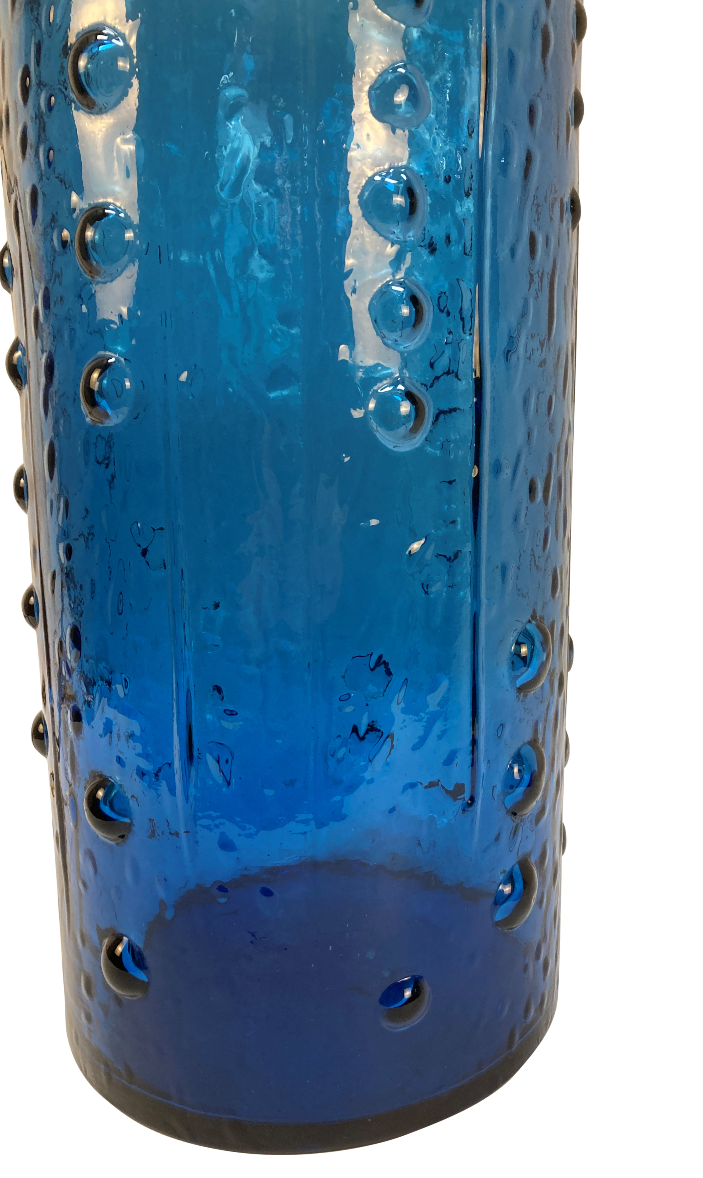 A large Italian Mid-Century hand blown glass lamp in blue, with brass fittings and gold silk cord.