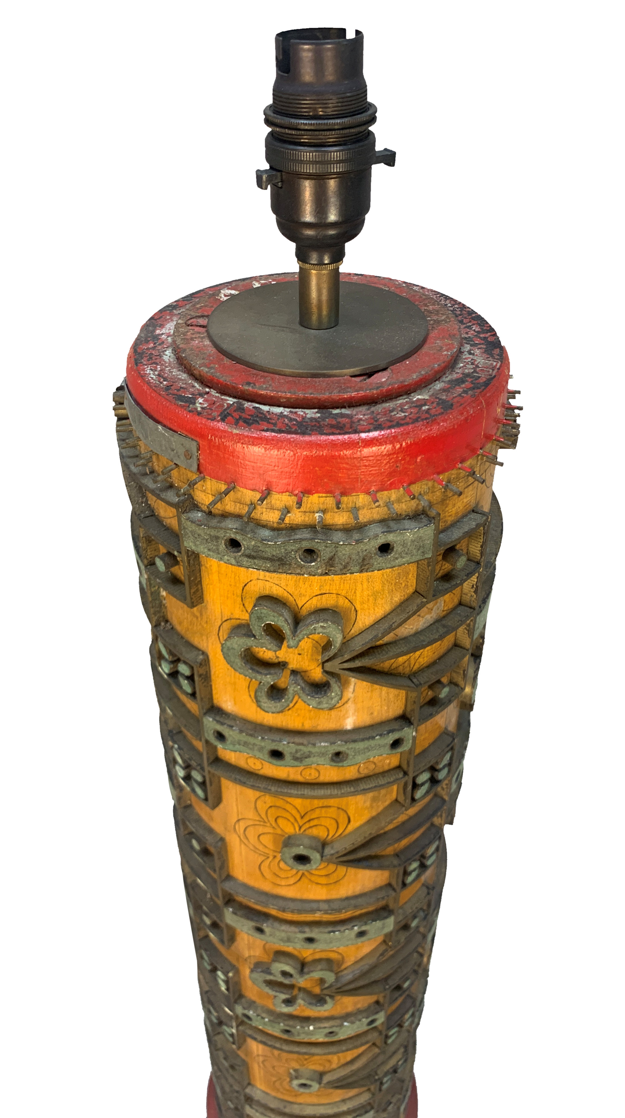A large English Victorian print roller, now converted into a lamp.