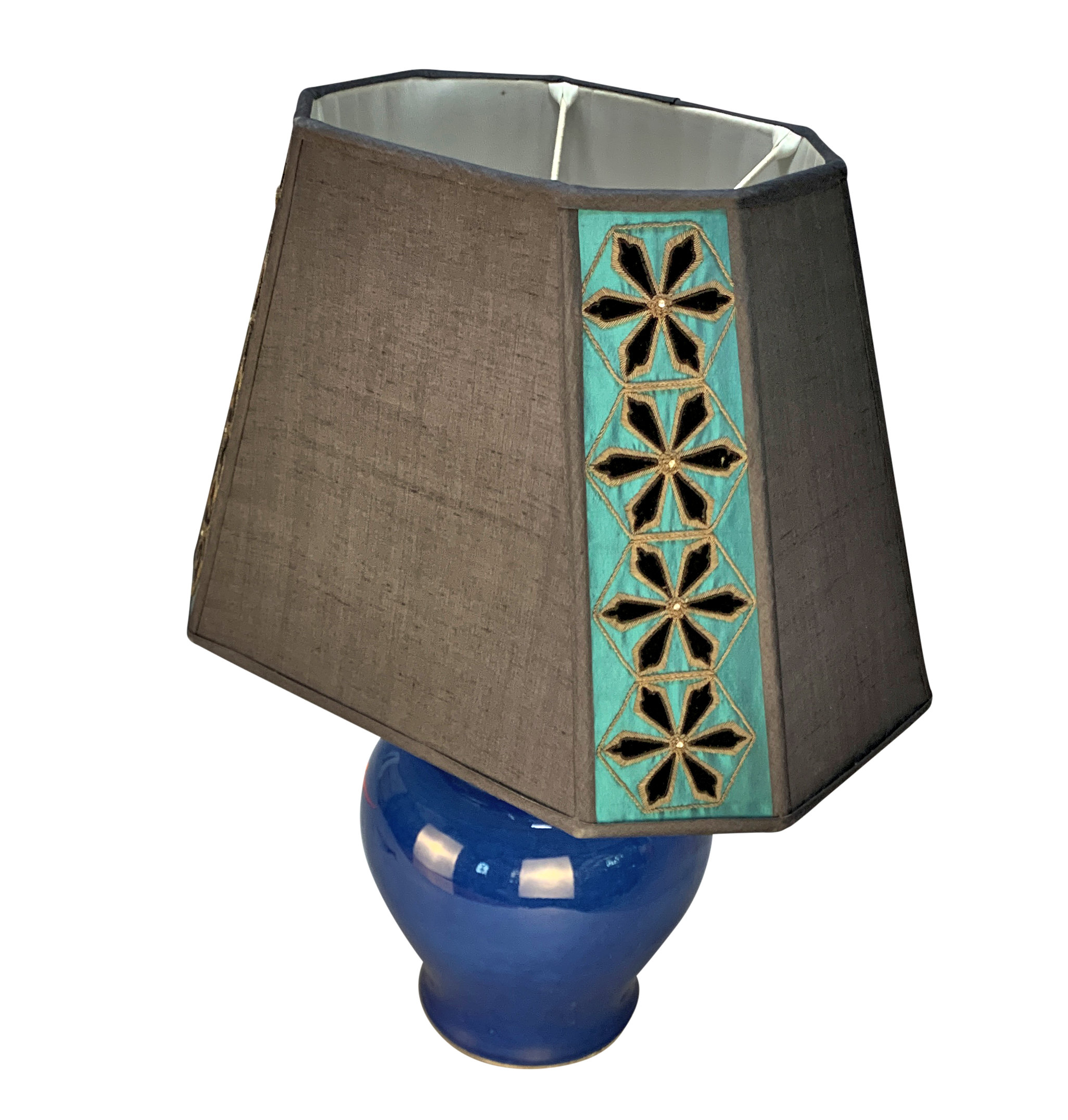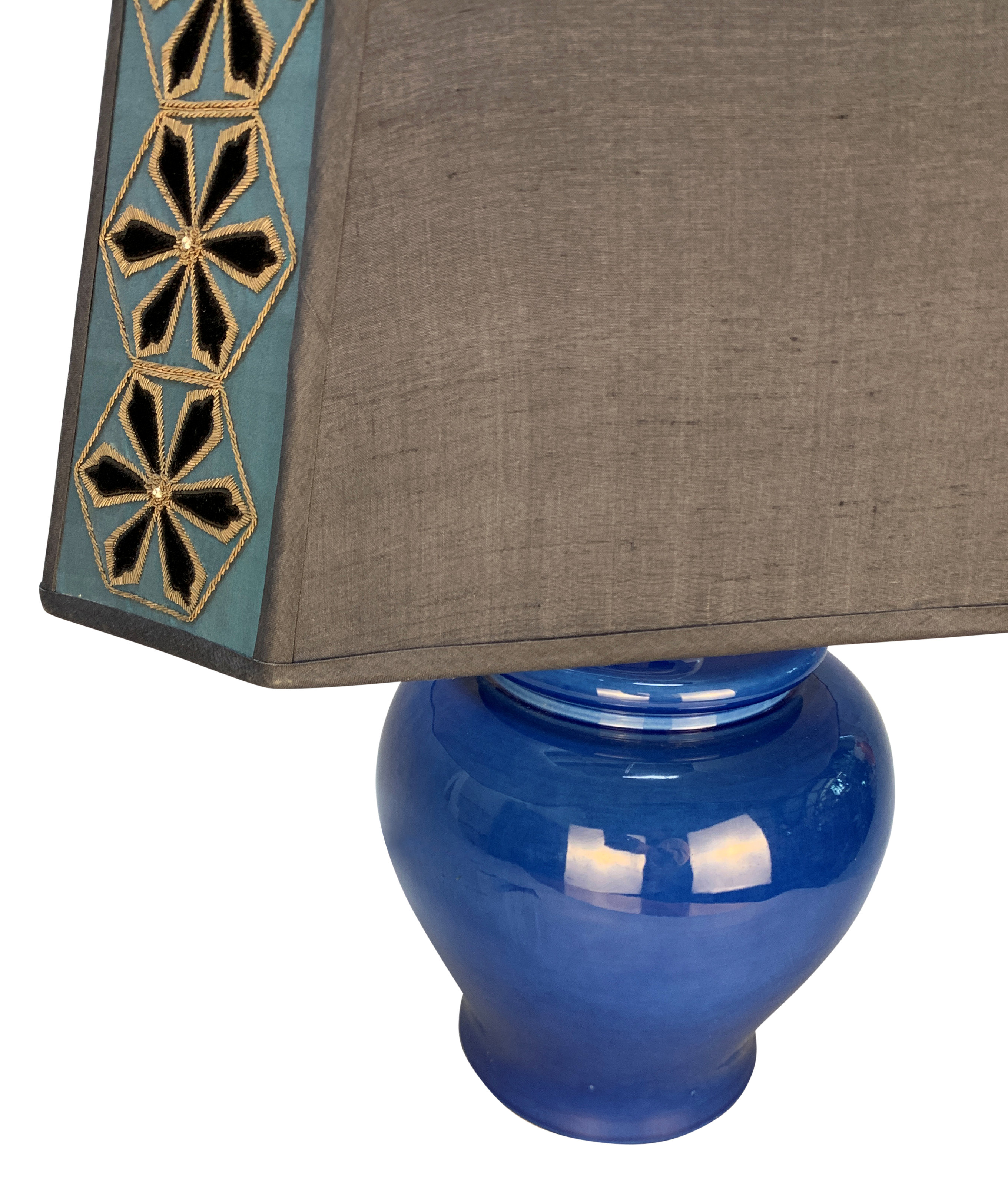An English Mid-Century blue ceramic table lamp with a hand stitched silk shade. The electrical cord of coral coloured silk.