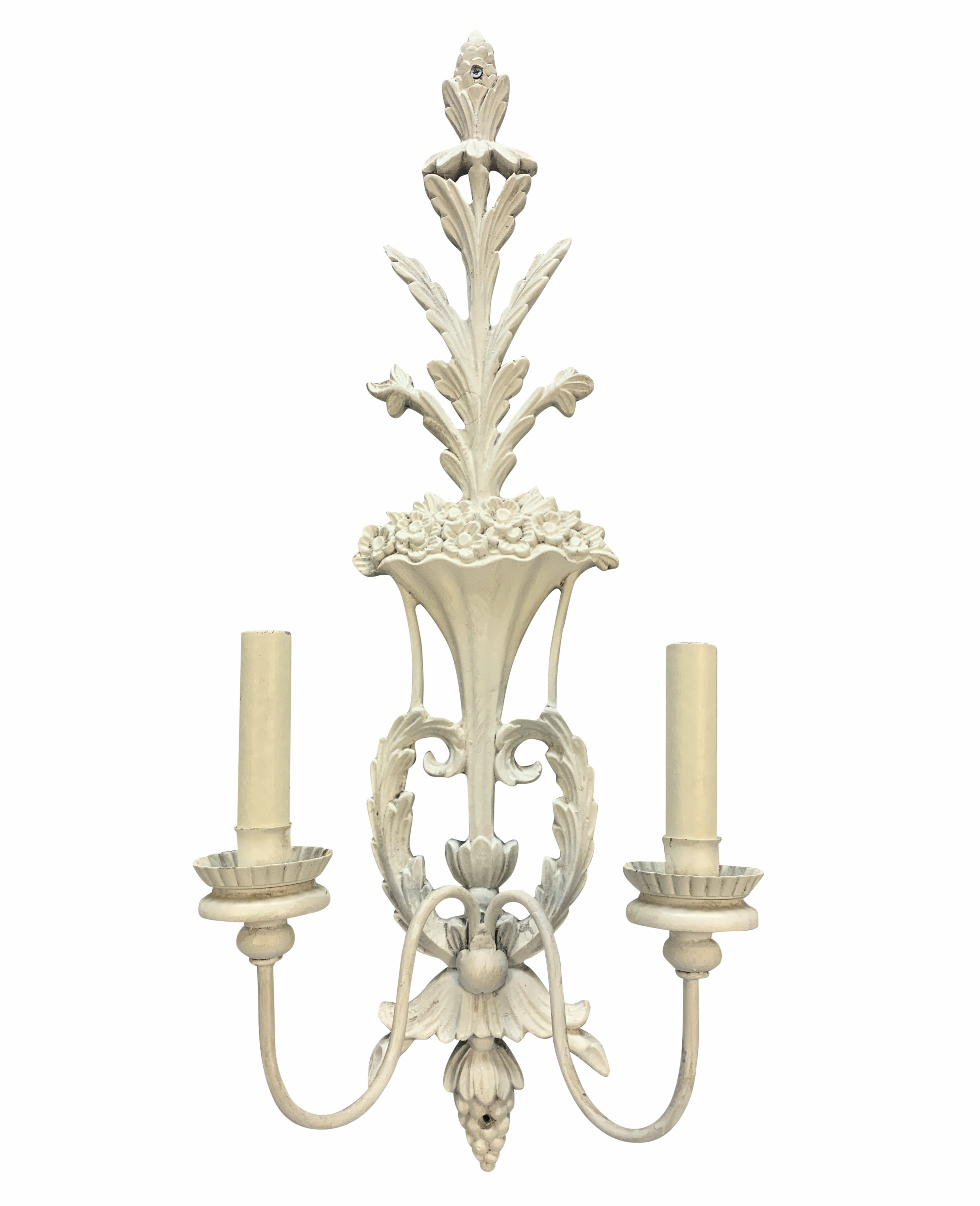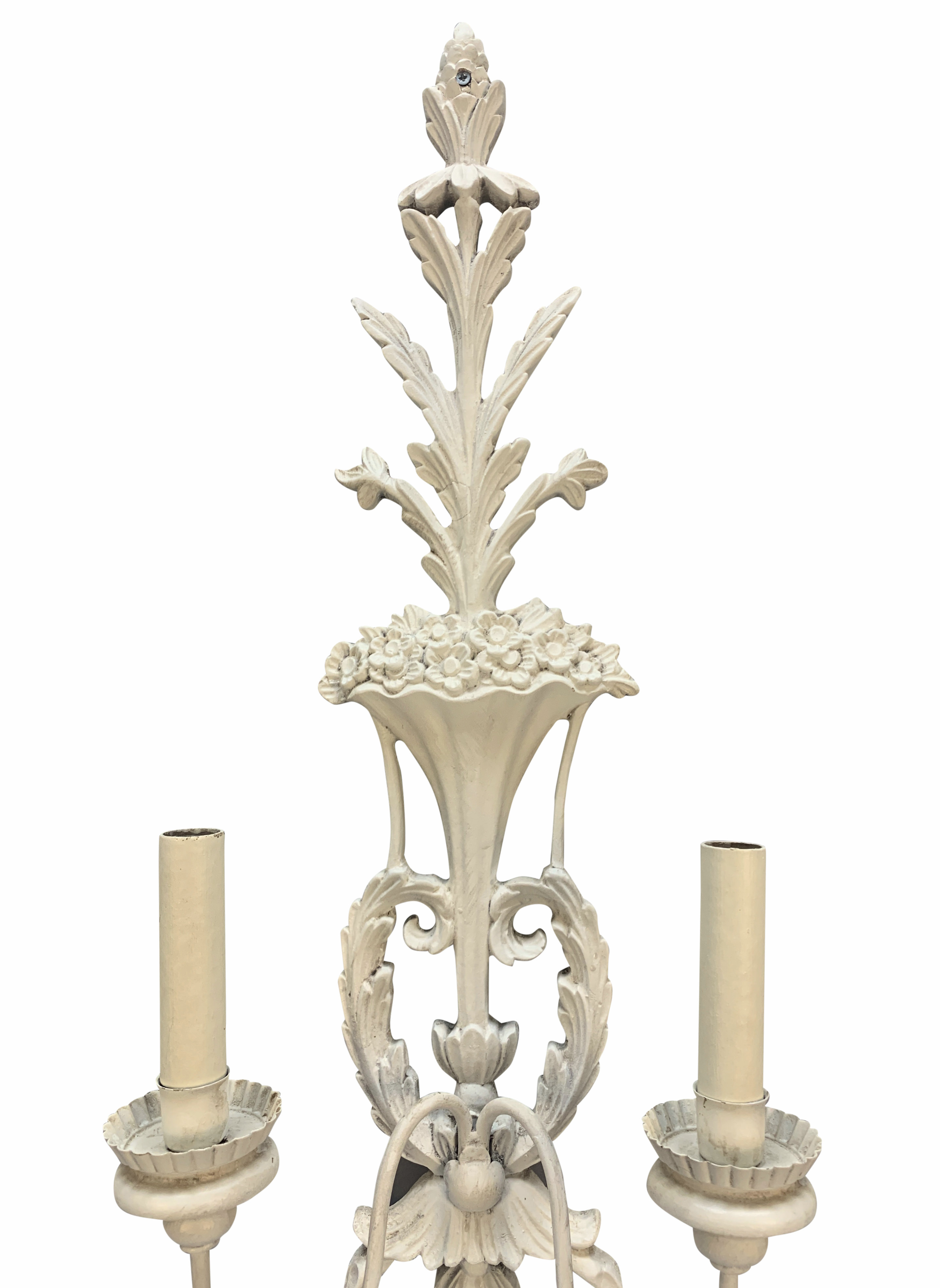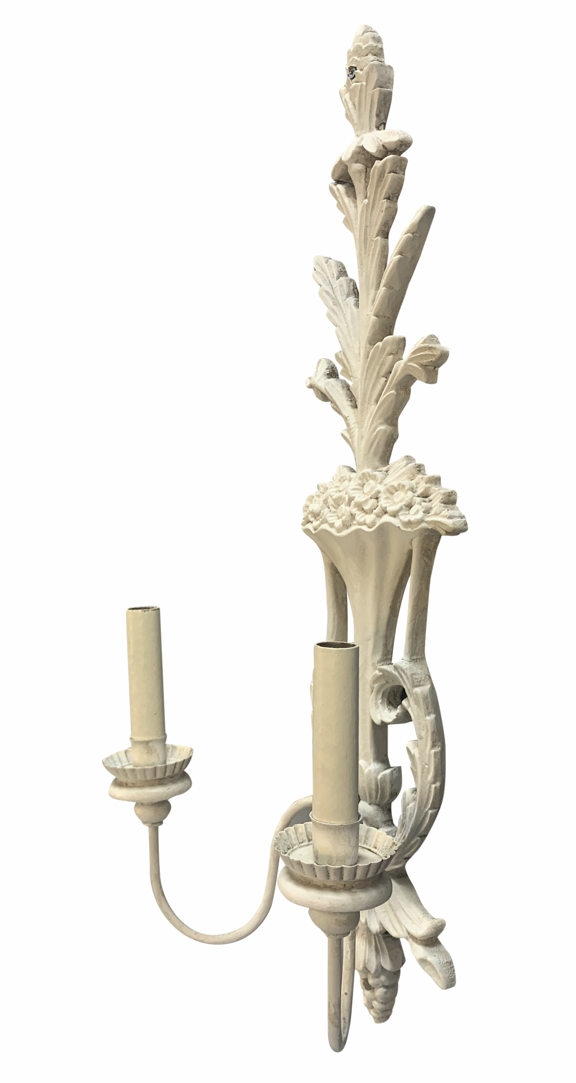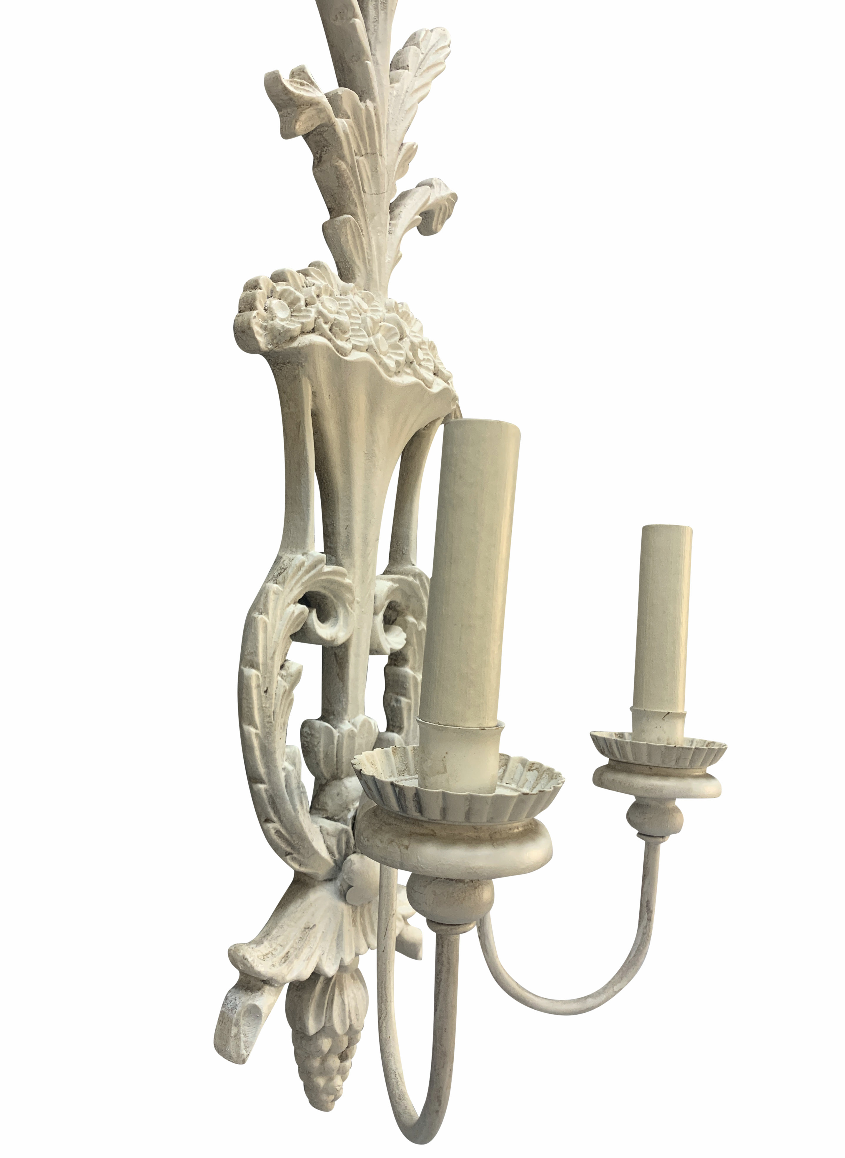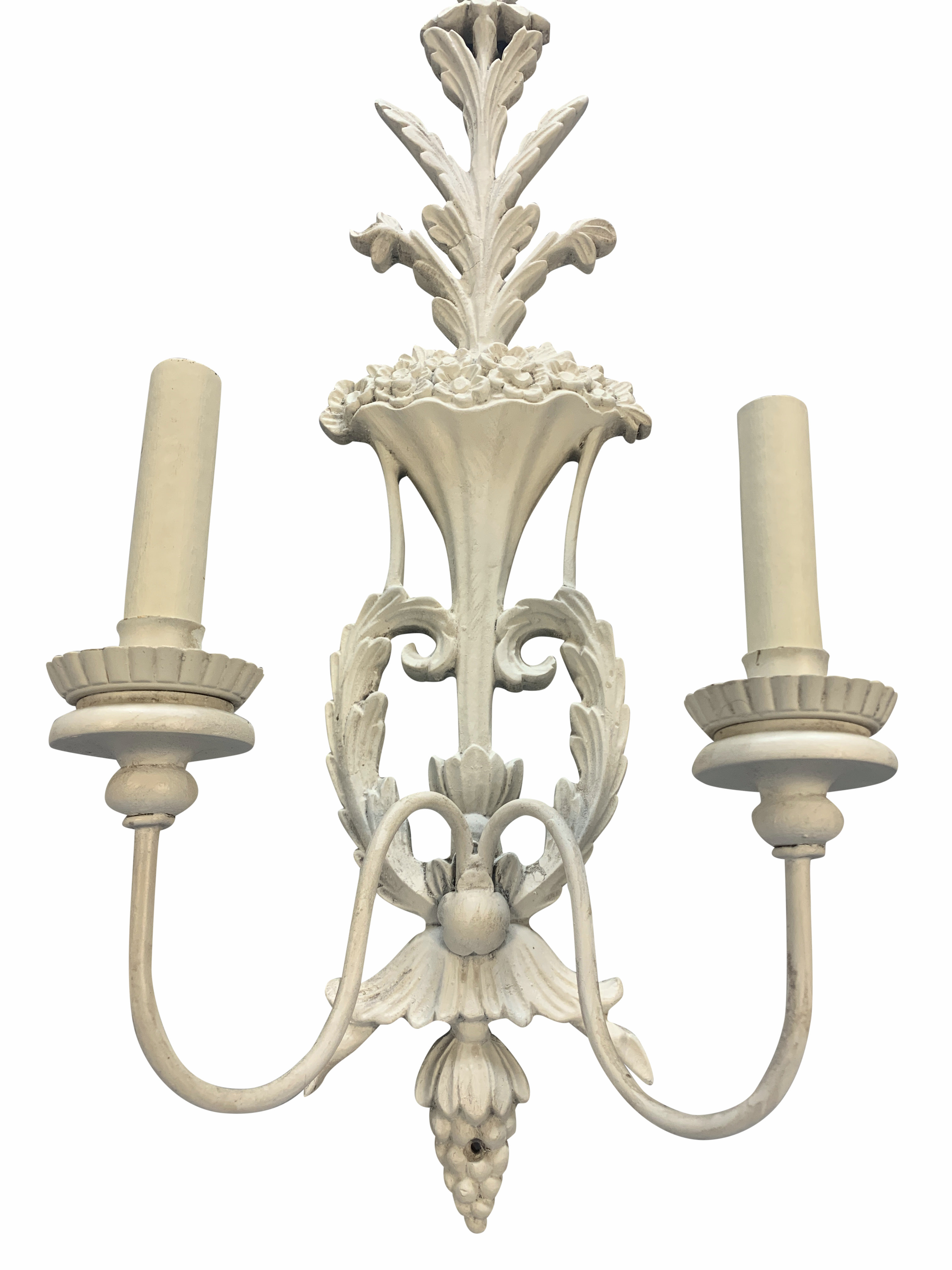 A pair of large French carved wood and gessoed twin branch wall lights.