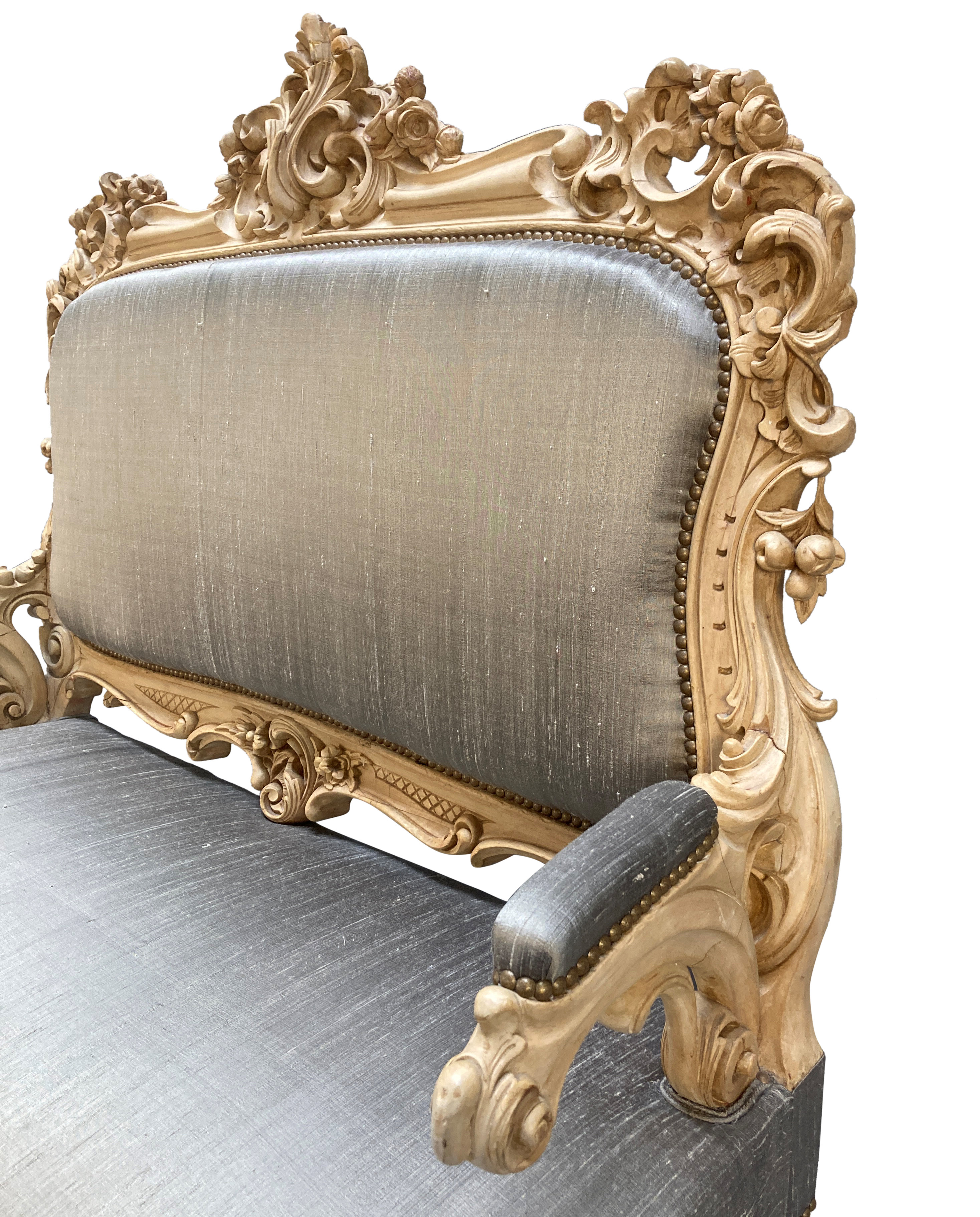 A German early XIX Century settee in the Rococo manner. In beautifully carved bleached fruitwood and upholstered in stone coloured silk with brass studs and brass caster feet.