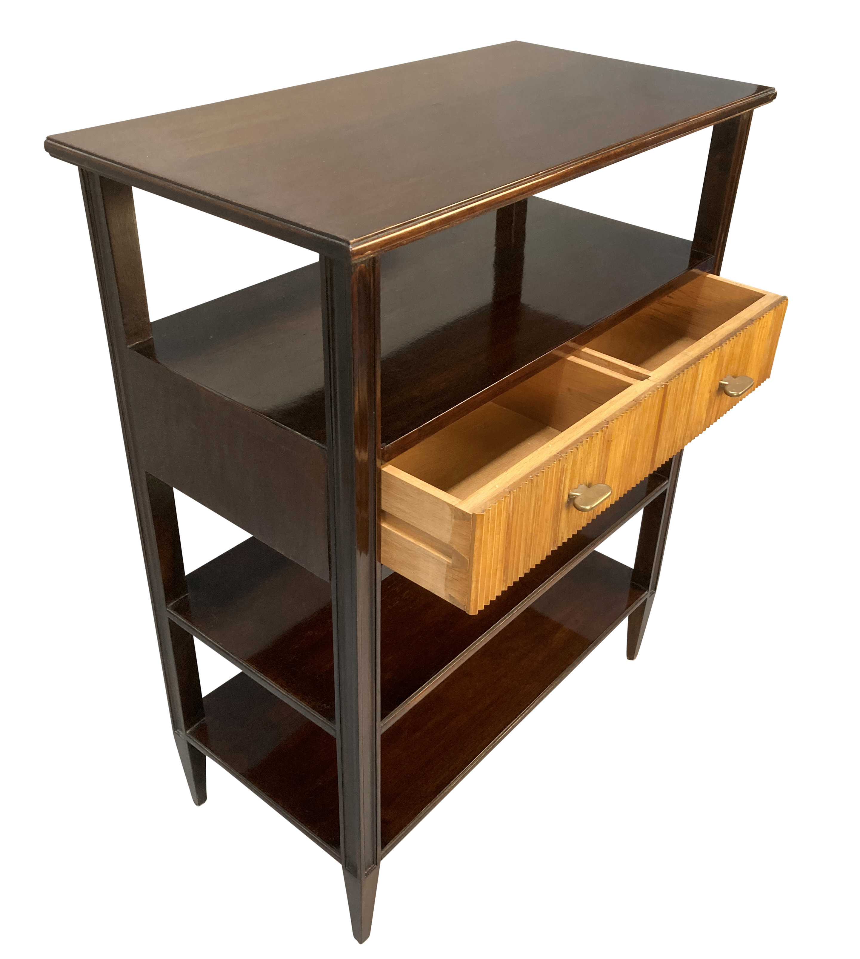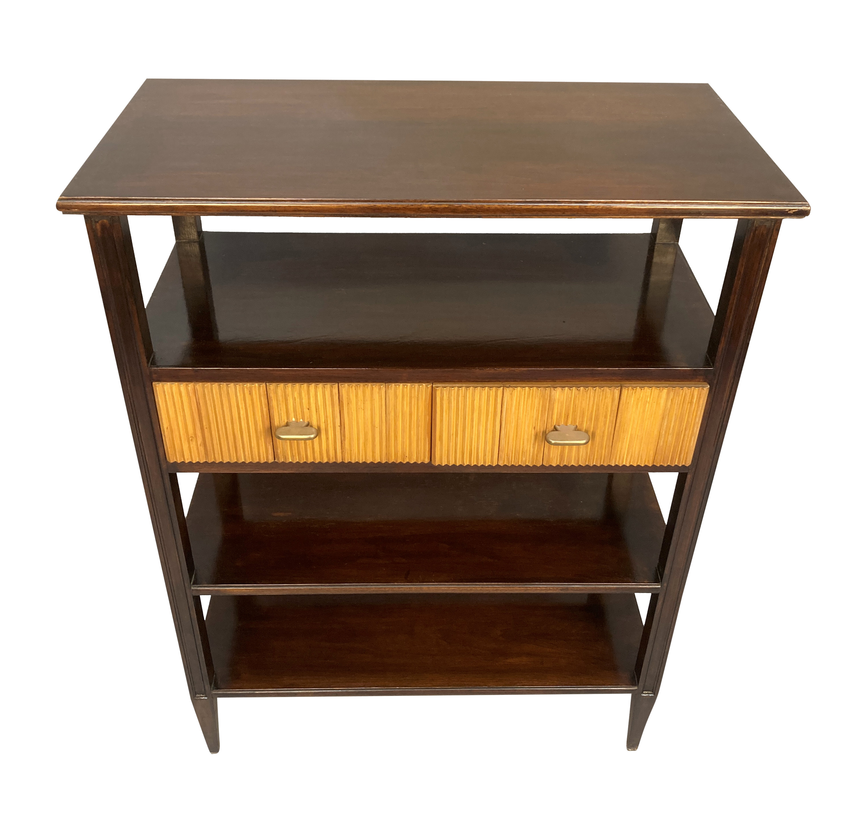 An Italian Mid-Century stained beechwood etagere, with a lower shelf and two tambor fronted fruitwwod drawers with brass handles.